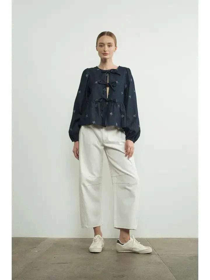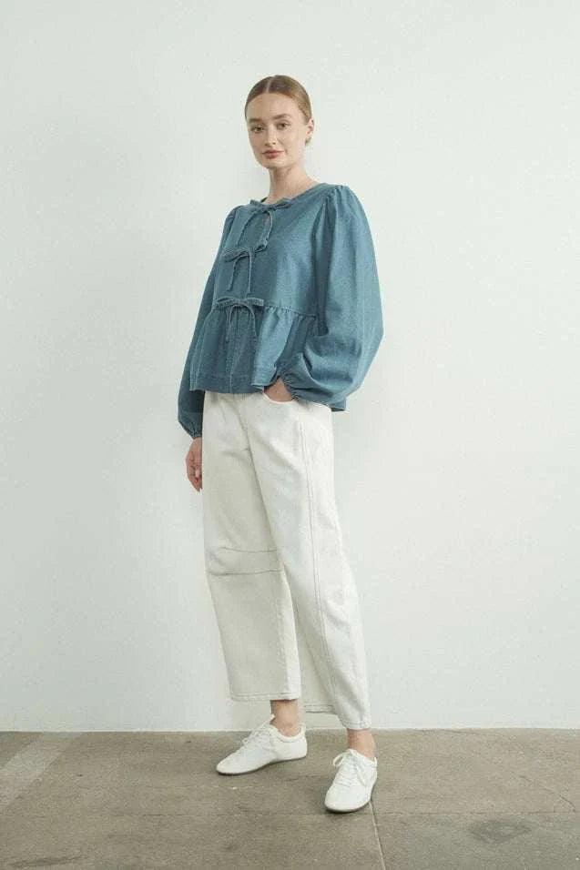 The standout feature of the Bow Tie Blouse is its feminine, oversized bow tie detail at the collar. This charming touch adds an air of sophistication and versatility, allowing you to tie it into a neat bow or let it hang loosely for a more relaxed yet still polished look. The blouse features a classic button-down design, with long sleeves that can be cuffed for a more tailored appearance, or left undone for a more laid-back, effortless style.