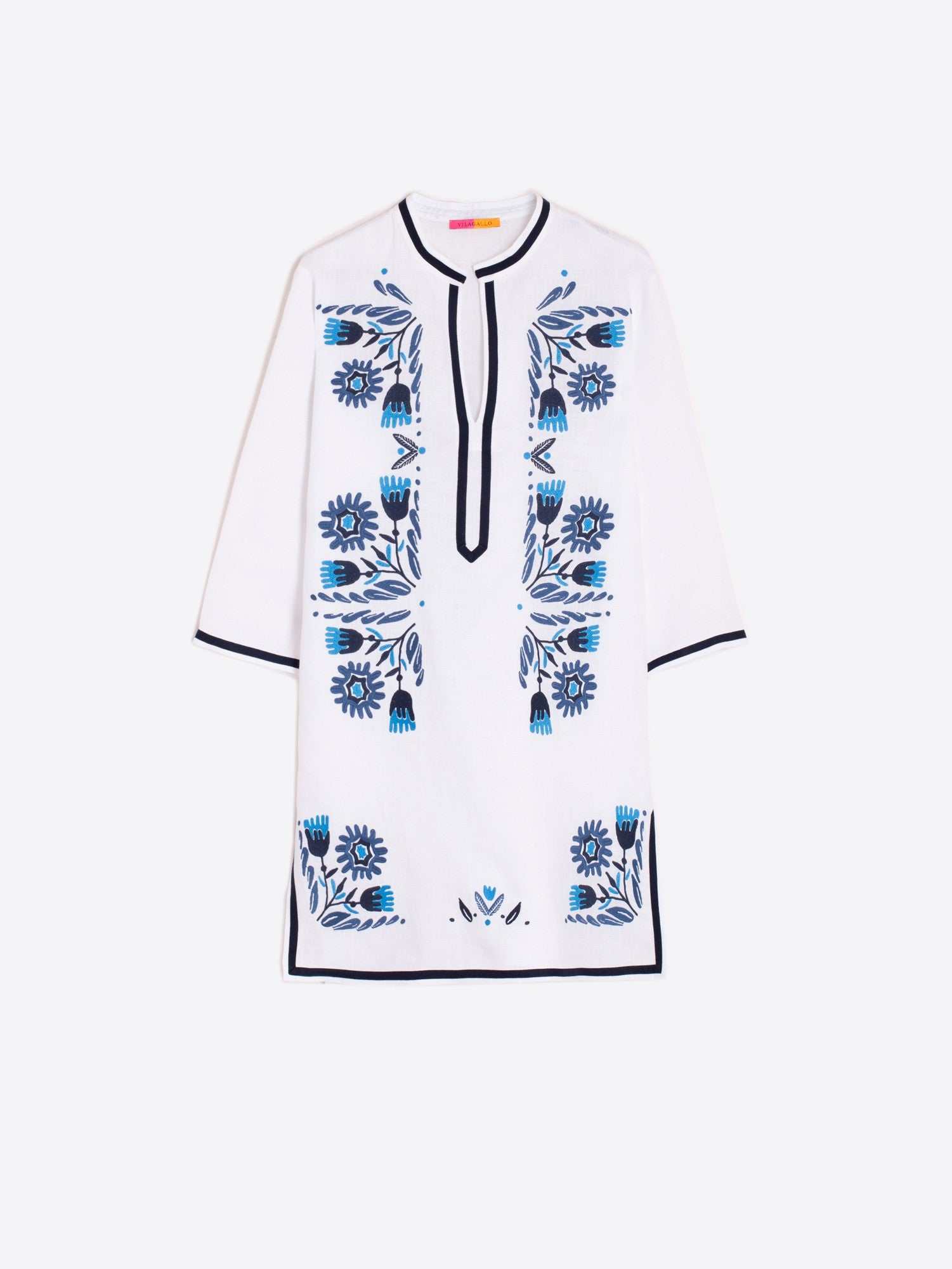 White linen kaftan with embroidered blue flowers. Vivid in navy blue. Neckline with V opening. Three-quarter sleeves. Openings on the sides. 100% linen.
