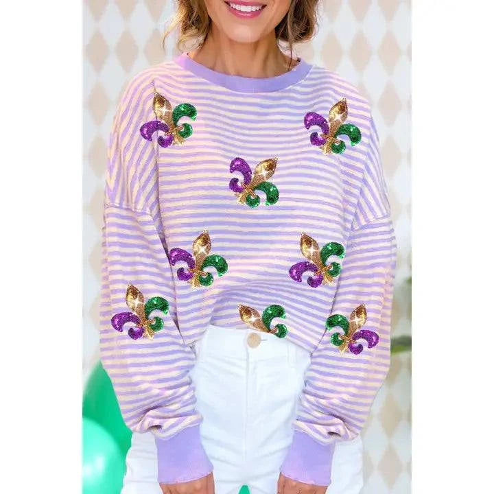 Elevate your style with our Sequin Mardi Gras Graphic Striped Sweatshirt. Experience the luxurious feel of sequin embellishments and make a statement this season. Add a touch of sparkle to your wardrobe with our eye-catching design.
