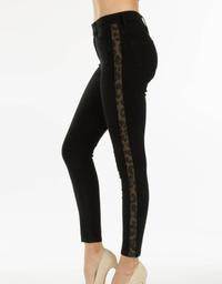 Elevate your travel wardrobe with the Women's High Rise Leopard Striped Jean by KanCan, featuring a bold animal pattern in a sleek black hue. These jeans offer a stylish skinny leg profile with a flattering high rise. Closure: Button closure. Perfect for fall adventures, they'll add a wild touch to your look
