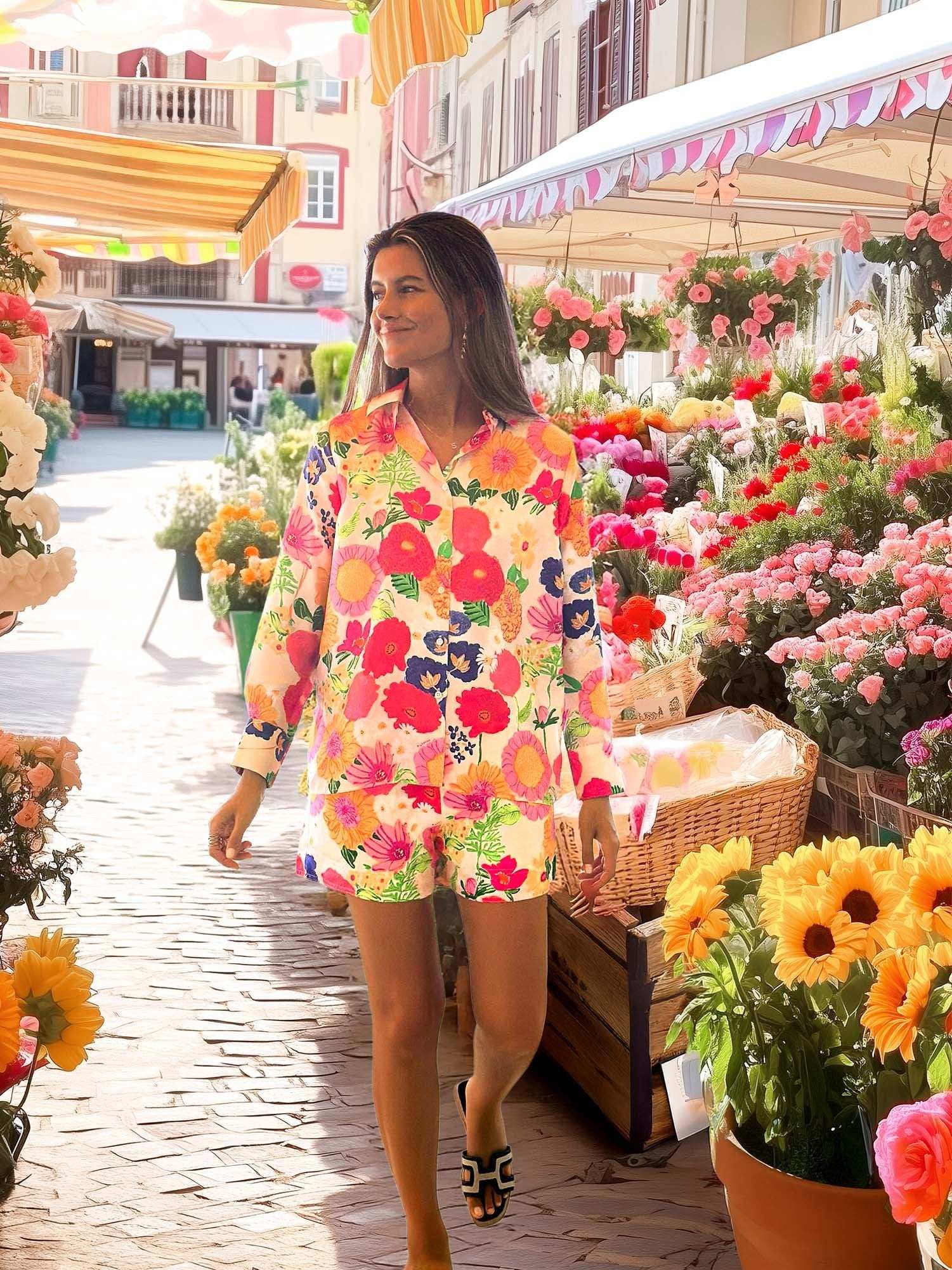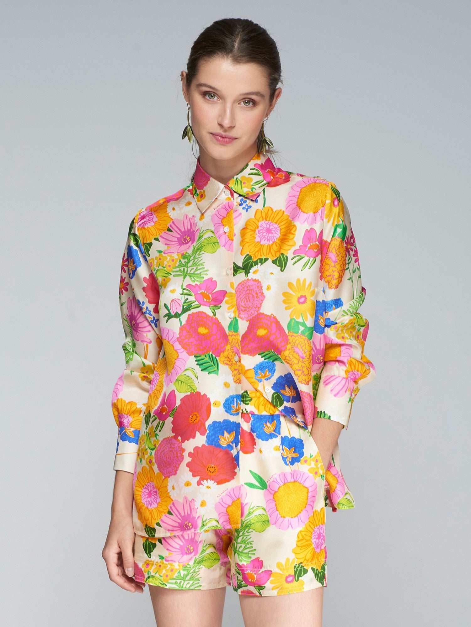100% silk Bermuda shorts with multicolored floral print. Elastic at the back of the waist. Two front pockets and one back pocket. Matching shirt available.