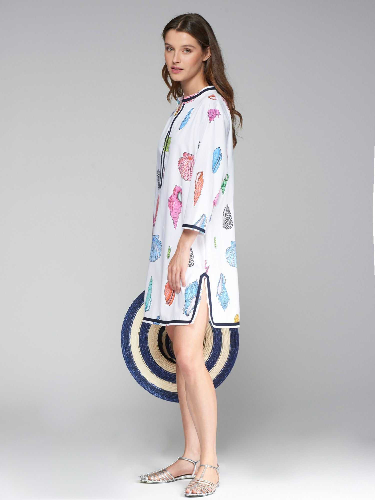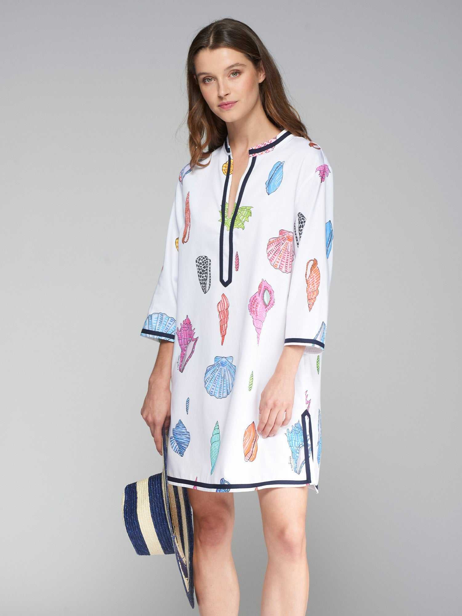 White short kaftan with colorful shells. Vivid in navy blue. Neckline with V opening. Three-quarter sleeves. Openings on the sides. 100% cotton.