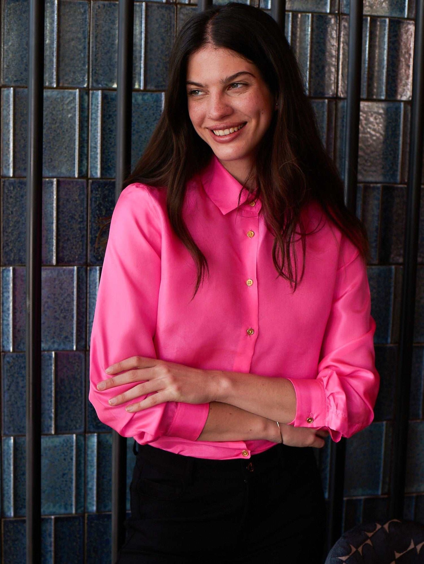 Versatile and stylish, this shirt pairs effortlessly with everything from tailored trousers and skirts to your favorite pair of jeans. Neon Silk Shirt Whether you opt for a polished, professional look or a more relaxed, laid-back vibe, the Neon Pink Silk Shirt adapts to any occasion. Layer it under a blazer for a touch of boldness at the office, or wear it solo for a night out on the town Neon Silk Shirt.