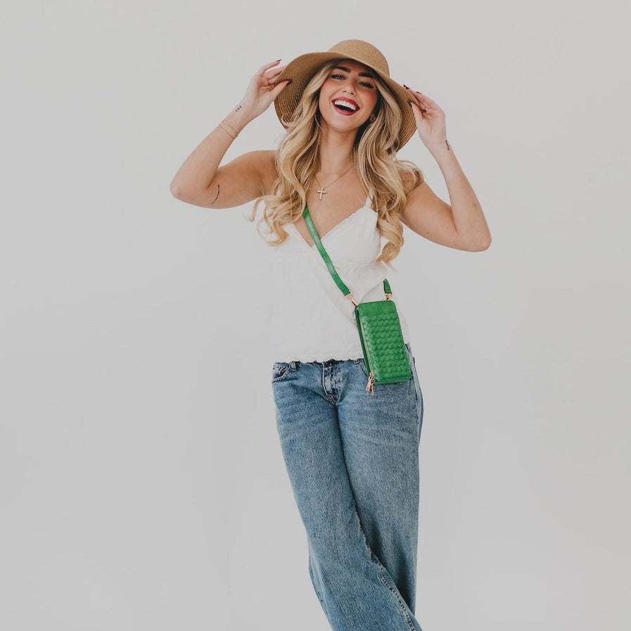 Meet our new WOVEN Double Duty Phone Bag! Slip your cell phone in the outer pouch for easy access, then unzip the bag to discover a cash pocket, card holders, and a coin purse - no more rummaging around for your stuff! Keep your essentials close by and always accessible.
