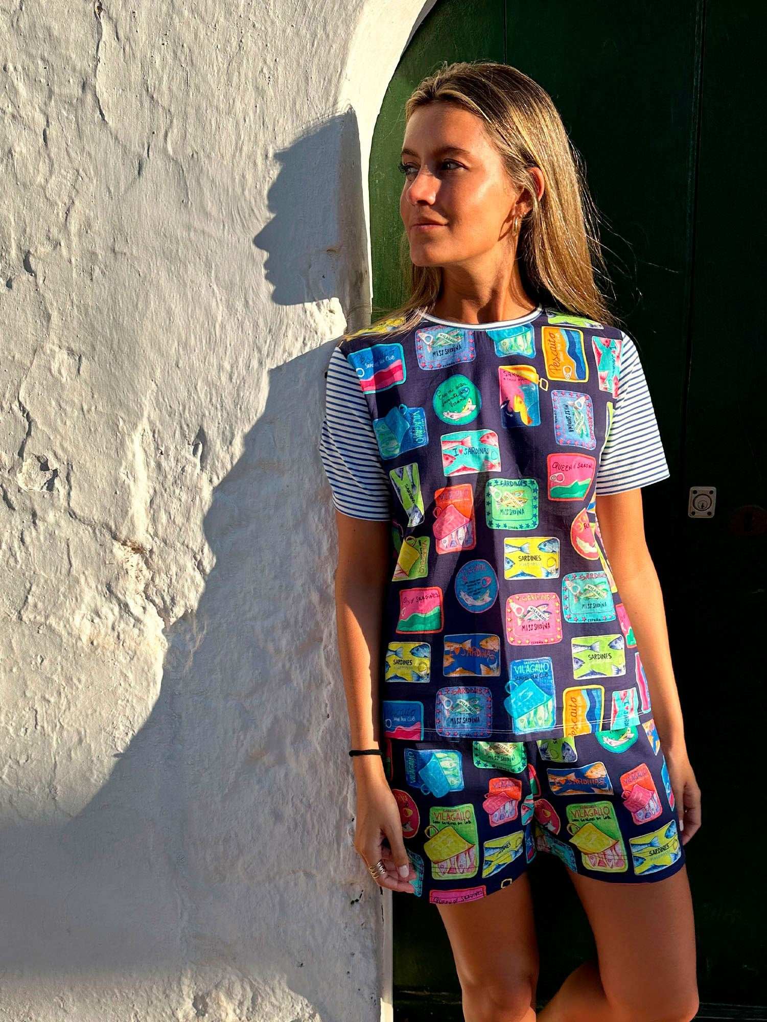100% cotton Bermuda shorts with exclusive Vilagallo sardine can print. Elastic at the back of the waist. Two front pockets and one back pocket. Matching shirt available.