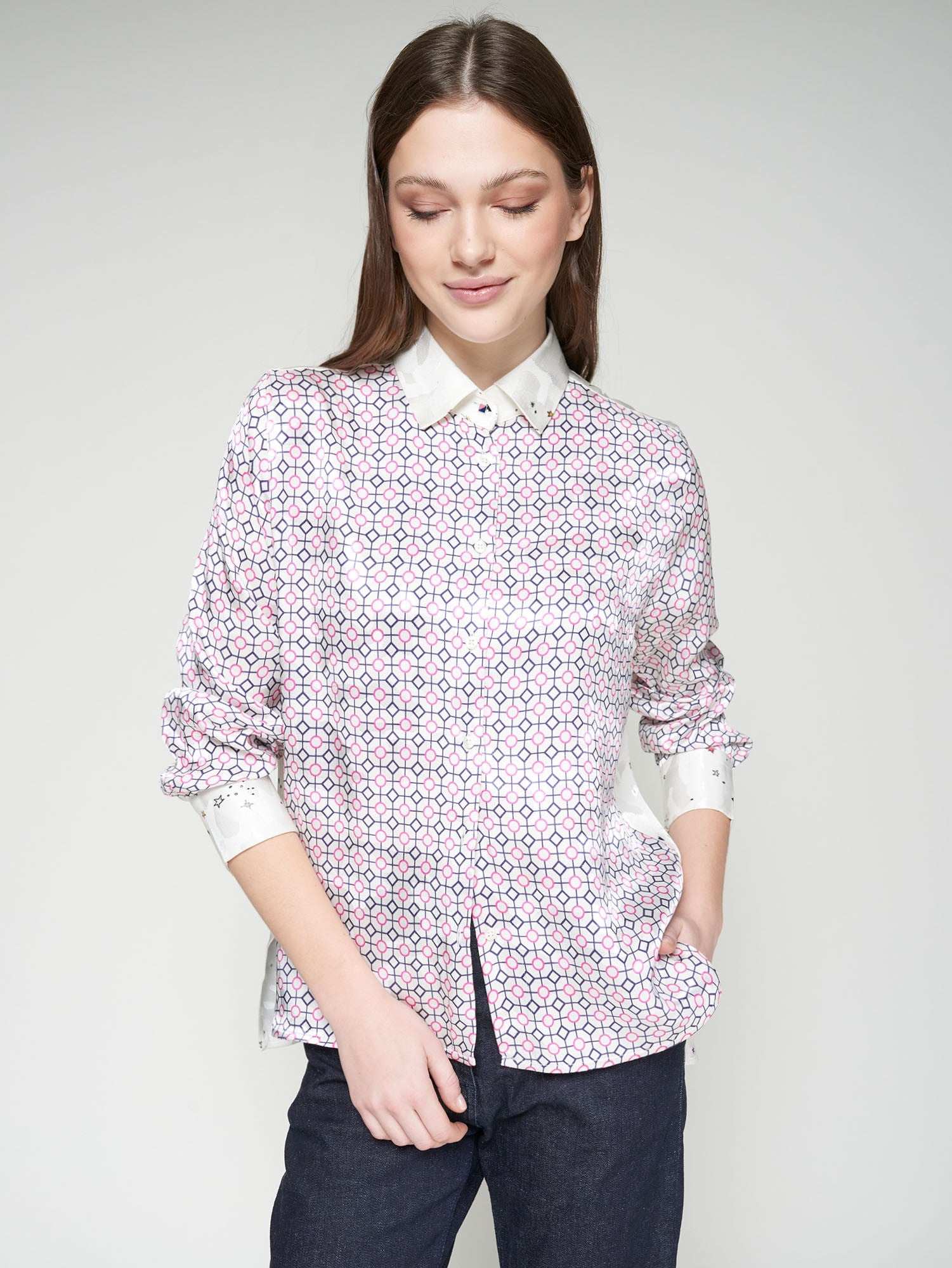 Straight-cut white shirt in satin jacquard fabric. Geometric print in the front and sleeves. Classic white collar and cuffs with cosmic print details. The back features a placed galaxy illustration galaxy. Front button fastening. Long sleeves and straight hem.