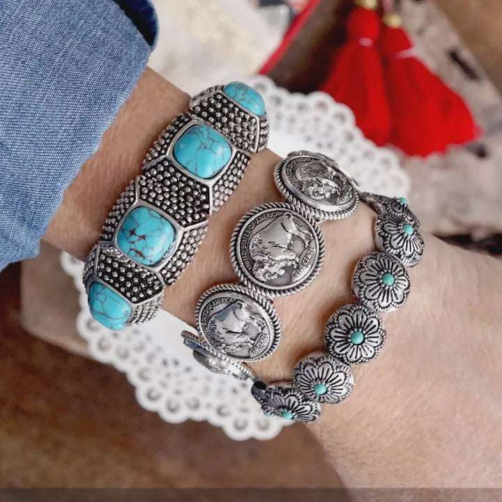 These chunky, Western-inspired stretchy bangles make a bold statement in worn burnished silver tone. Available in three unique designs—Buffalo Coins, Turquoise Squares, or Flowers—each bangle offers a distinctive look and an easy, one-size-fits-most fit.